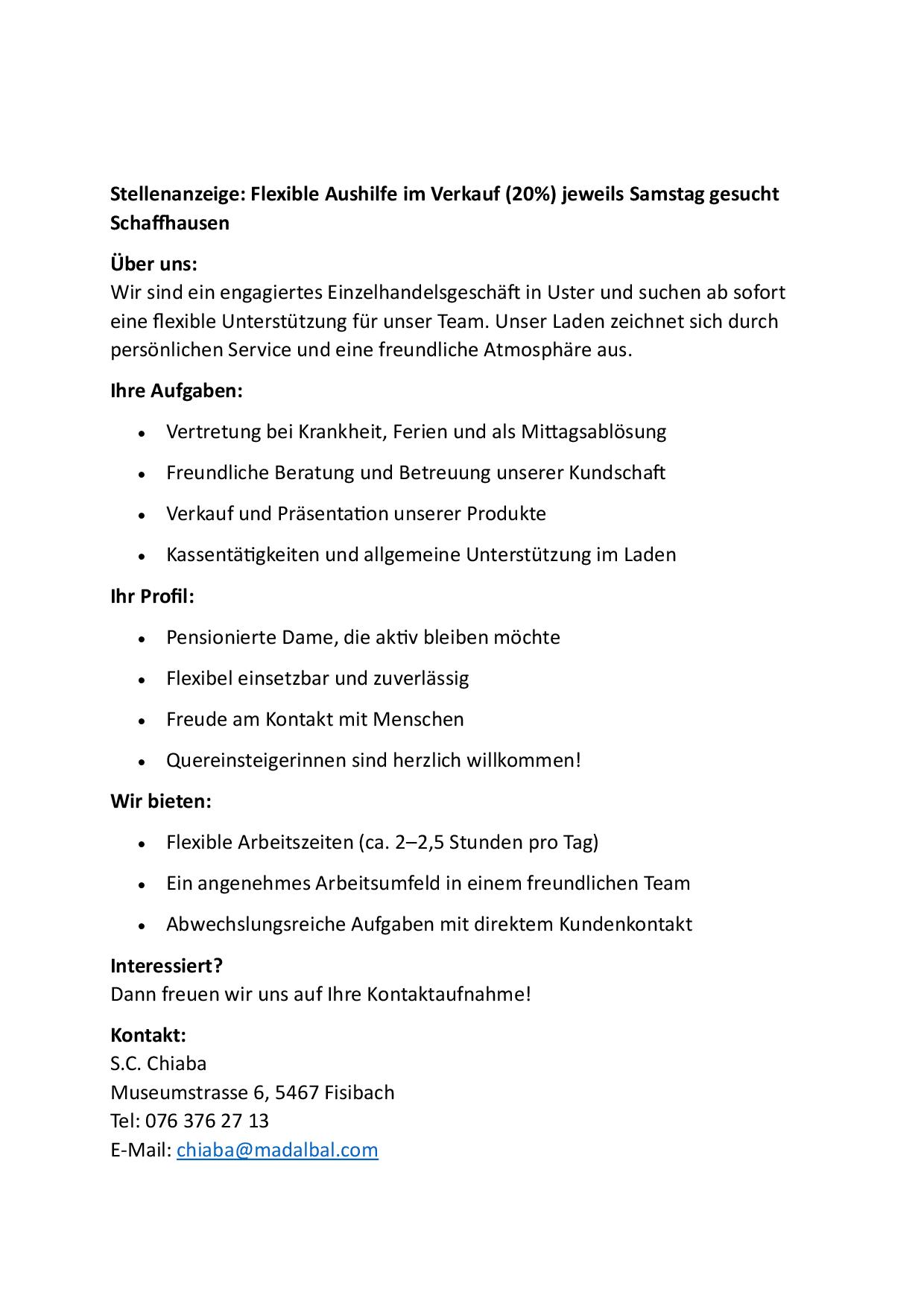 Recherche aide flexible dans la vente 20% - ( min. 2 samedis ) région Schaffhouse